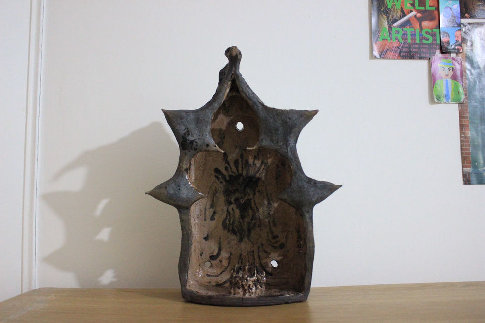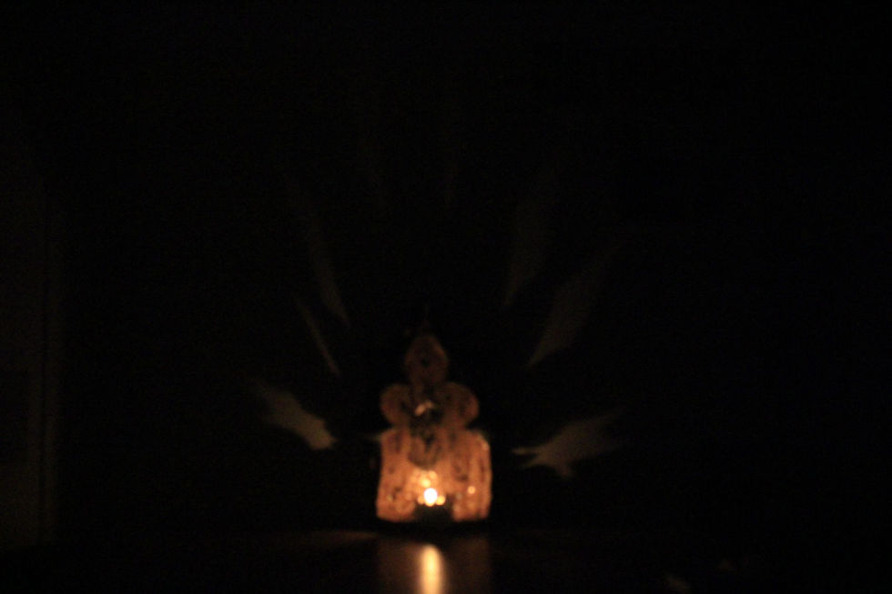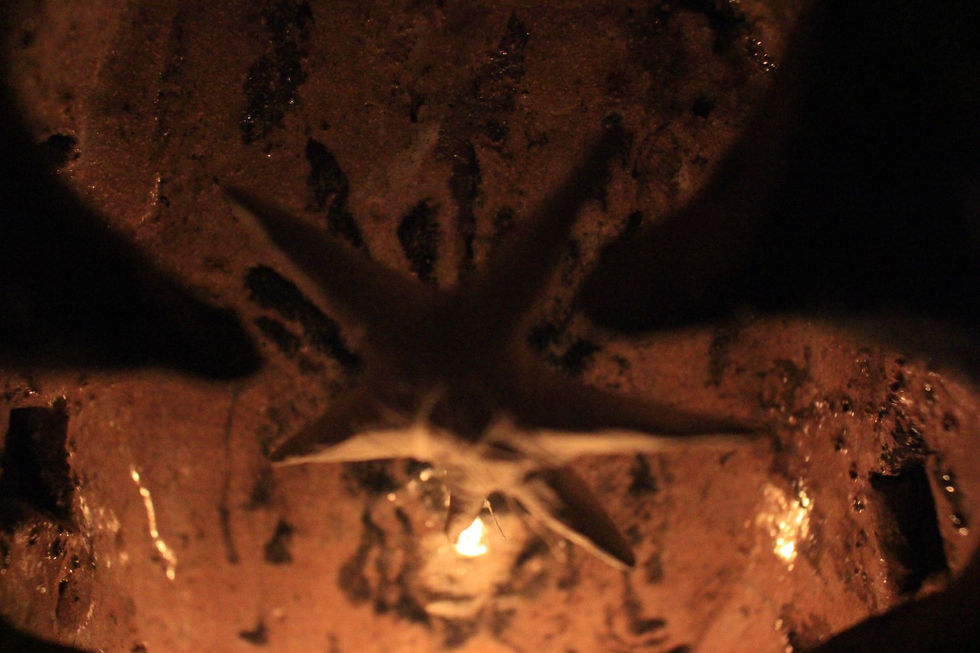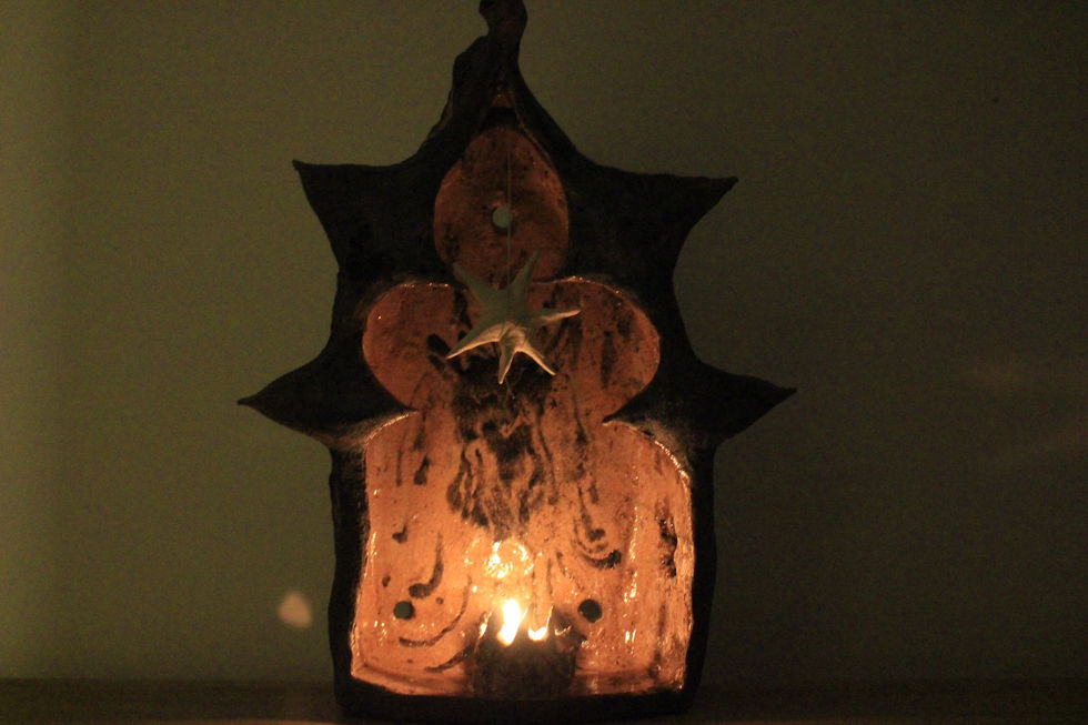 This piece is designed to be an altarpiece of secular worship, centred around a candle and cut with stars to shine onto the walls